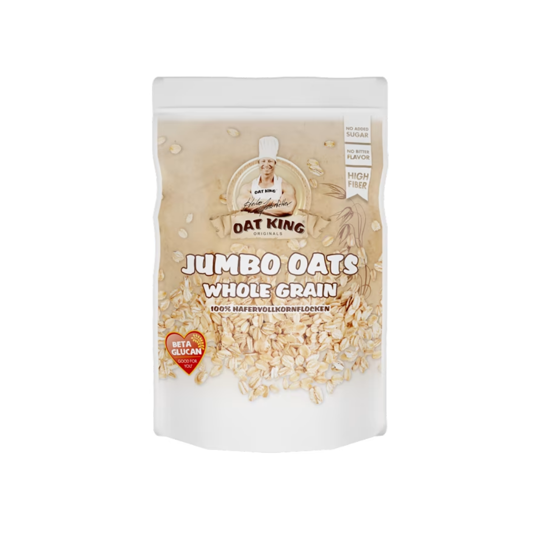 Oat King Jumbo Oats Whole Grain – flocons d’avoine complets 100% sans OGM, source naturelle de glucides et de fibres, parfaits comme base nutritive pour petit-déjeuner, smoothies, porridge ou recettes santé.